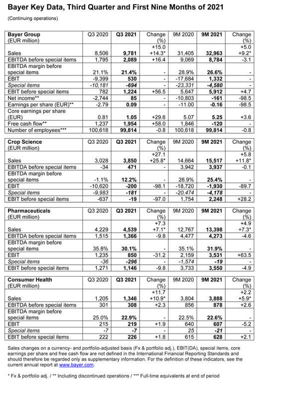拜耳集團(tuán)2021財(cái)年第三季度財(cái)報(bào)銷售額上漲14.3%,達(dá)到97.81億歐元